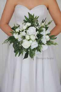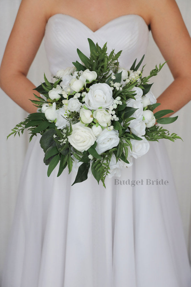 This magnificent rounded brides’ bouquet is crafted using of the highest quality white roses. This elegant bouquet is sure to leave a lasting impression. The delicate dark greenery and babies breath in this collection, create a bright and dazzling arrangement that is sure to turn heads. With a mixture of foliage and greenery this bouquet is sure to make a statement. All of our bouquets are a wonderful option for destination weddings, as they can be bought in advance and easily stored and transported. This bouquet is approximately 12” wide.