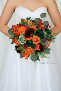 This magnificent rounded brides’ bouquet is crafted using a stunning fall mixture of burgundy, dark green, cabernet, sage green, orange, burnt orange and terracotta. This elegant bouquet is sure to leave a lasting impression. The delicate maple leaves in this collection, create a bright and dazzling arrangement that is sure to turn heads. With a mixture of berries and greenery this bouquet is sure to make a statement. All of our bouquets are a wonderful option for destination weddings, as they can be bought in advance and easily stored and transported. This bouquet is approximately 12” wide.