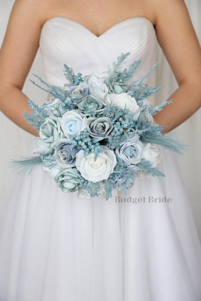 This magnificent rounded brides’ bouquet is crafted using of the highest quality of dusty blue, light blue, ice blue, steel blue and mist blue. This elegant bouquet is sure to leave a lasting impression. With a mixture of babies breath and dusty blue pampas grass this bouquet is sure to make a statement. All of our bouquets are a wonderful option for destination weddings, as they can be bought in advance and easily stored and transported. This bouquet is approximately 12” wide.