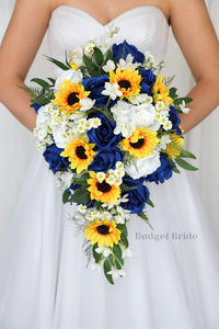 This lovely assortment of royal blue and white roses accented with sunflowers and mini daisies is bound to turn heads on your wedding day. This lovely cascading brides’ bouquet is an absolutely breathtaking arrangement for any bride to be.  Bright greenery and small white accent flowers complete the look and add a delicate realism to this beautiful bouquet. This bouquet is 10” wide, 18” long, and is crafted by our in-house florists without using a foam base to anchor the flowers to the bouquet. Instead, we wire our bouquets by hand so that we can further ensure that our cascading bouquets will keep their shape and stay durable during shipping and transport. If you love the style of this bouquet but you have chosen a different color in mind, please note that color changes are free of charge and we would gladly assist you. If you would like a color that we do not appear to offer on our site, not to worry - we also offer custom dye options so that you can have the exact color you dreamt of for your special day.