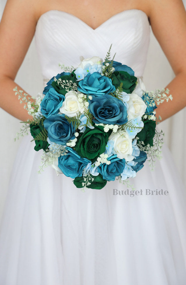 This stunning brides’ bouquet is crafted using roses of the highest quality. The delicate roses in a mixture of dark green, ink blue, peacock blue and ivory in this collection, create a bright and dazzling arrangement that is sure to turn heads. With a mixture of babies breath and greenery this bouquet is sure to make a statement. All of our bouquets are a wonderful option for destination weddings, as they can be bought in advance and easily stored and transported. This bouquet is approx 12” wide.