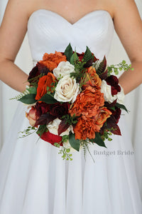 This magnificent rounded brides’ bouquet is crafted using burnt orange, rust, champagne and wine roses and peonies of the highest quality. This elegant bouquet is sure to leave a lasting impression. With a mixture of soft greenery this bouquet is sure to make a statement. All of our bouquets are a wonderful option for destination weddings, as they can be bought in advance and easily stored and transported. This bouquet is approximately 12” wide.