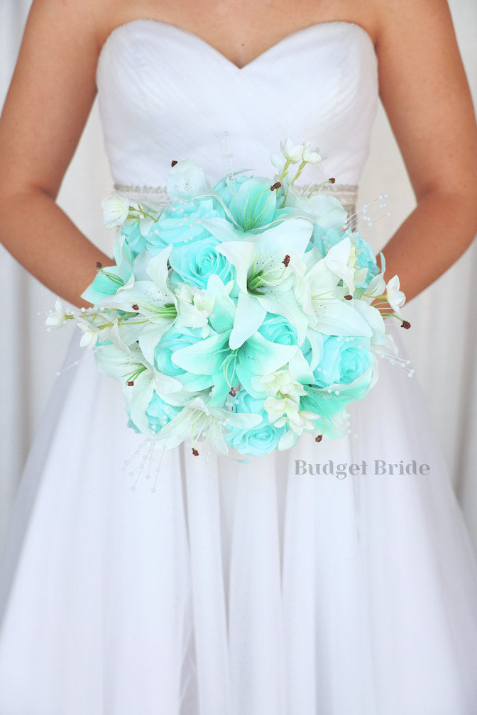 This lovely assortment of roses and lilies is bound to turn heads on your wedding day. This lovely brides’ bouquet is created with white lilies, teal centered lilies, teal roses and accent pearls complete the look and add a delicate realism to this beautiful bouquet. This bouquet is 10” wide, 18” long, and is crafted by our in-house florists without using a foam base to anchor the flowers to the bouquet. Instead, we wire our bouquets by hand so that we can further ensure that our cascading bouquets will keep their shape and stay durable during shipping and transport. If you love the style of this bouquet but you have chosen a different color in mind, please note that color changes are free of charge and we would gladly assist you. If you would like a color that we do not appear to offer on our site, not to worry - we also offer custom dye options so that you can have the exact color you dreamt of for your special day.